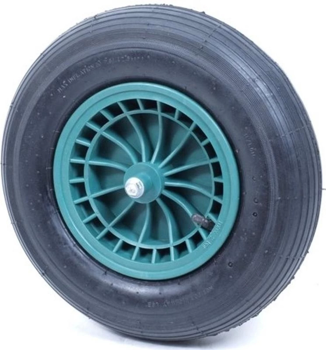Kruiwagenwiel met band en as. Het betreft een luchtbandwiel, belastbaar tot 180 kg, waardoor het verplaatsen van zware ladingen geen enkel probleem vormt. Kenmerken: – Diameter wiel: 400 mm. – Wielbreedte: 100 mm. – As lengte: 75 mm. – As diameter: 20 mm. – Wielas: 128 mm x 75 mm x 20 mm. – Bandmaat: 4.80 / 4.00-8. – Draagkracht per wiel: 180 kg bij 2 bar.