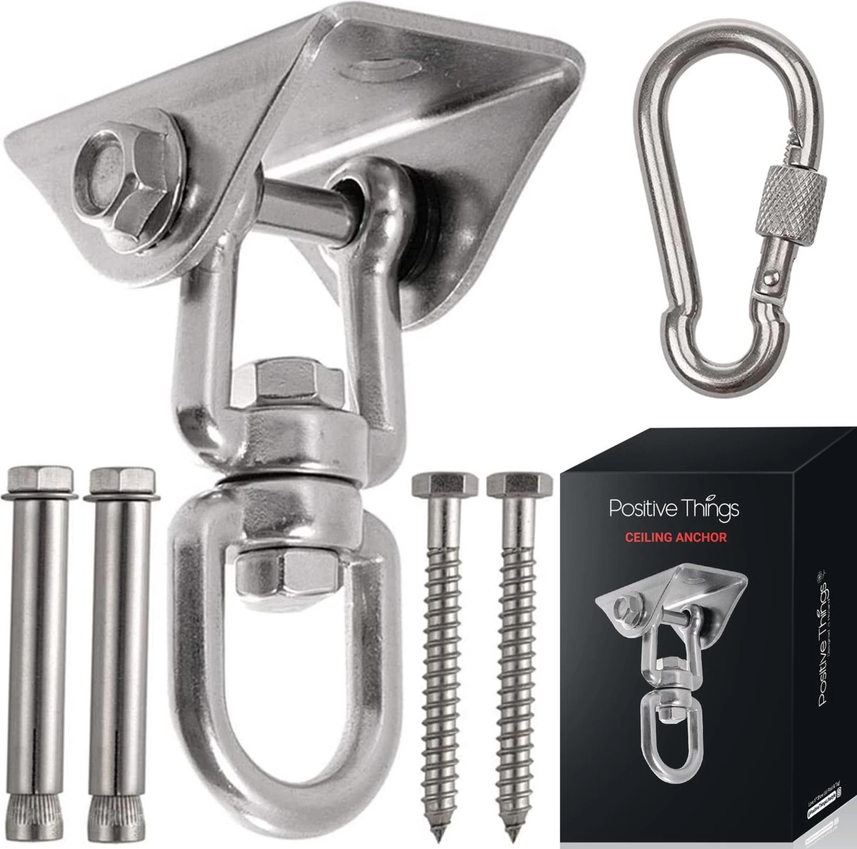 Creëer jij een paradijs door hangstoelen, schommels, boksballen en hangmatten op te hangen met onze plafondhaak? Dit is een geweldige oplossing voor verschillende producten met een ophangsysteem! Met een draaifunctie van 360 graden en een super veilig en sterk systeem, kunt u uw hangstoel, schommel of ander attribuut gemakkelijk zelf ophangen. Doordat het ophangsysteem bestaat uit hoogwaardig rvs-materiaal is de set bestendig tegen alle weerstandsomstandigheden. Als de ophanghaak eenmaal vast zit kun jij genieten van alle verschillende mogelijkheden!