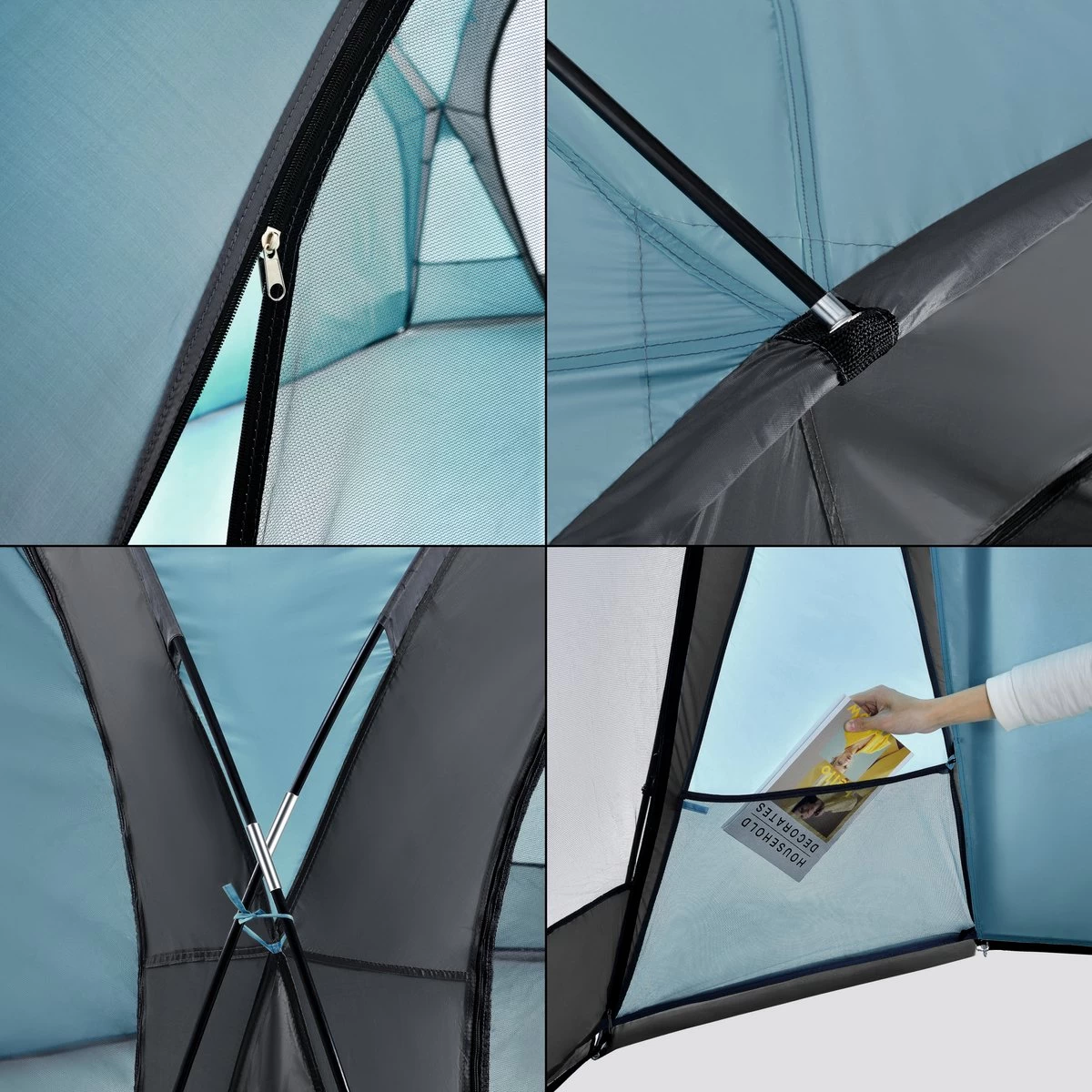 – Zijwanden en dak: 100% polyester 190T, PU gecoat