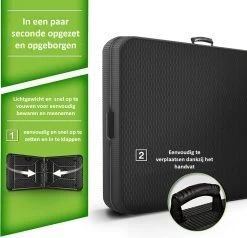 Deze handige klaptafel neemt opgevouwen zeer weinig ruimte in beslag, hij namelijk bijopvouwen slechts 8 cm dik. Het opzetten gebeurt binnen een minuut en dankzij de veiligheidssluitingen staat de tafel dan gelijk zeer stevig. De antislip poten zorgen ervoor dat de tafel niet wegglijdt. Het handige handvat zorgt voor makkelijk dragen en opbergen. Met zijn moderne uitstraling past de tafel binnen elke tuin en bovendien kan het kunststof tegen een stootje. Het is namelijk krasbestendig, weer bestendig en UV-bestendig. Van deze tafel zal je lang plezier hebben!