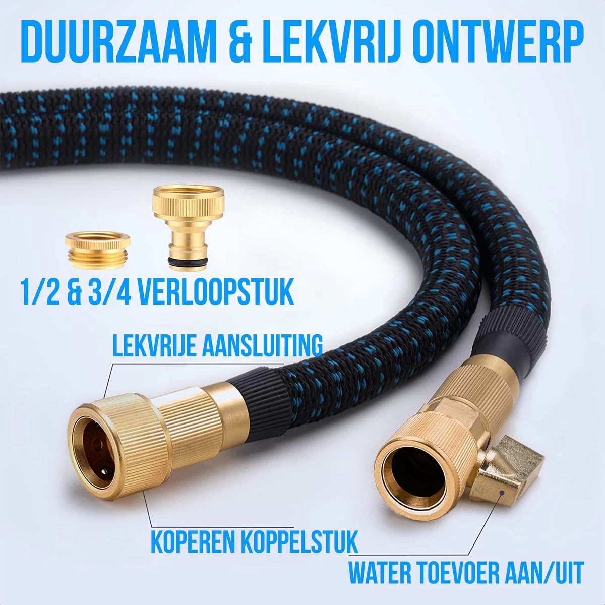 Strex Flexibele Tuinslang 15M Met Sproeikop – Uitrekbaar – Incl. Koppelingen, Ophanghaak & Opbergzak