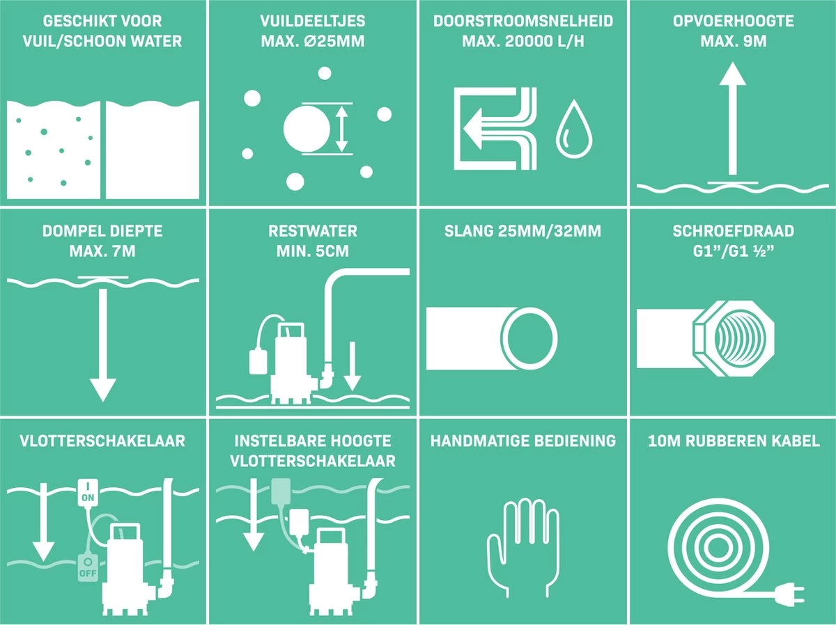 VONROC Dompelpomp RVS – Vuilwaterpomp – Waterpomp – 1100W – 20000 L/h – Voor Vuil- En Schoonwater – Met Vlotter