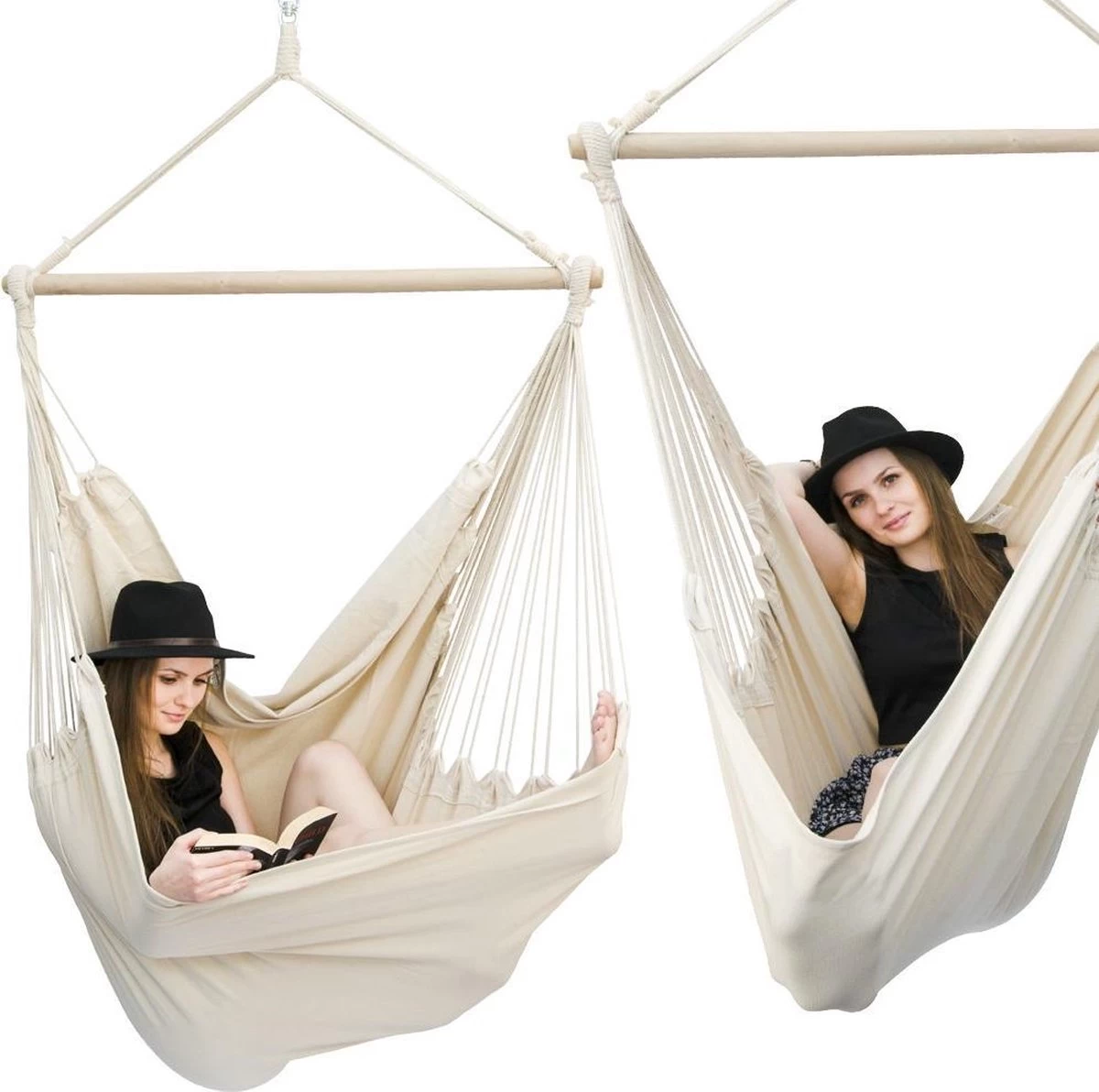 Daarom is onze luxe hangstoel ook uitgerust met een gigantisch stoffen oppervlak – zelfs grote volwassenen kunnen zich hier volledig uitrekken.